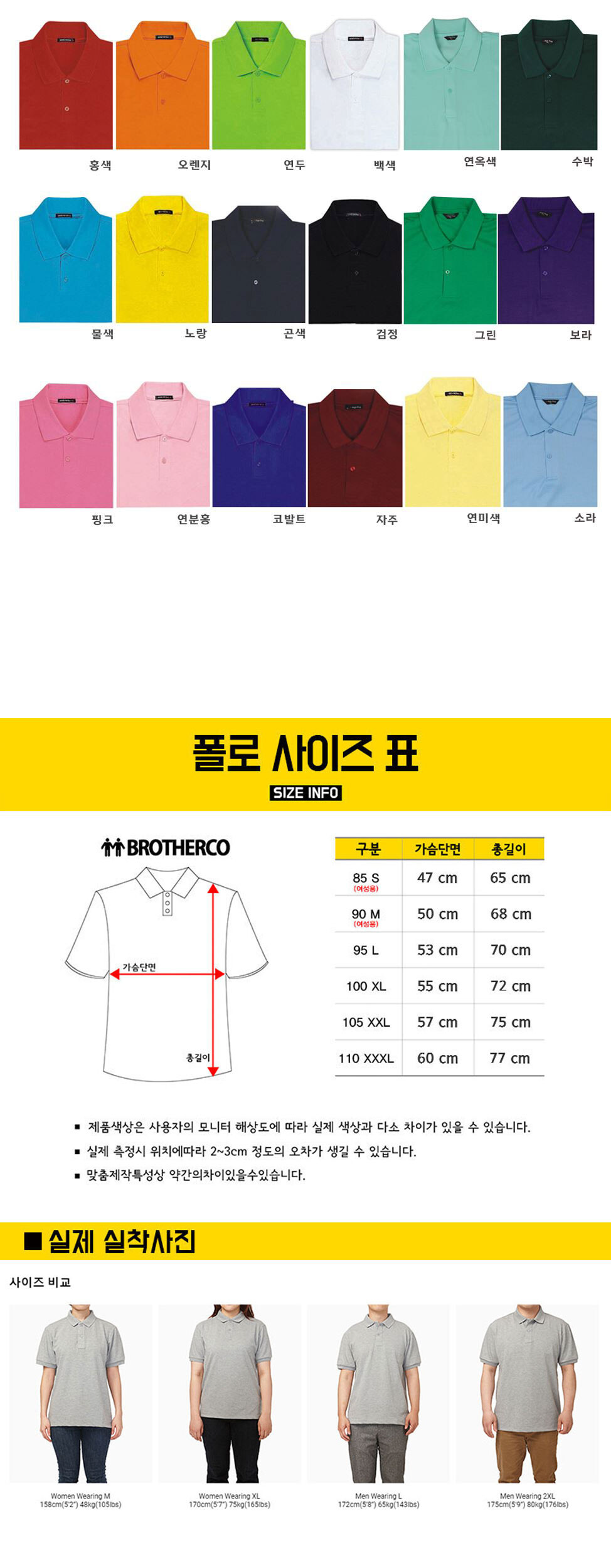 색상 검정, 곤색, 그린, 노랑, 보라, 소라, 수박, 연두, 연미색, 연분홍, 연옥색,
