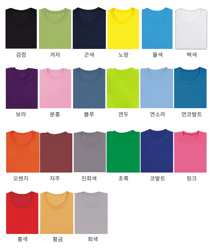 검정, 겨자, 곤색, 노랑, 물색, 백색, 보라, 분홍, 블루, 연두, 연소라,