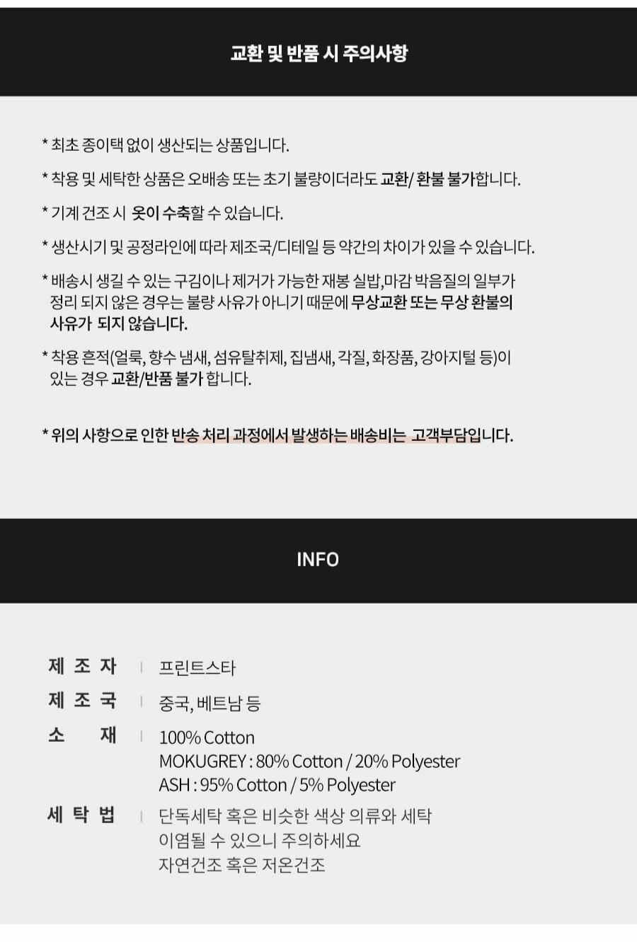 인쇄가 들어가지 않은 무지상품의 경우 교환가능하며, 판매자의 실수로 인한 오류/불량은 항시 교환가능합니다.